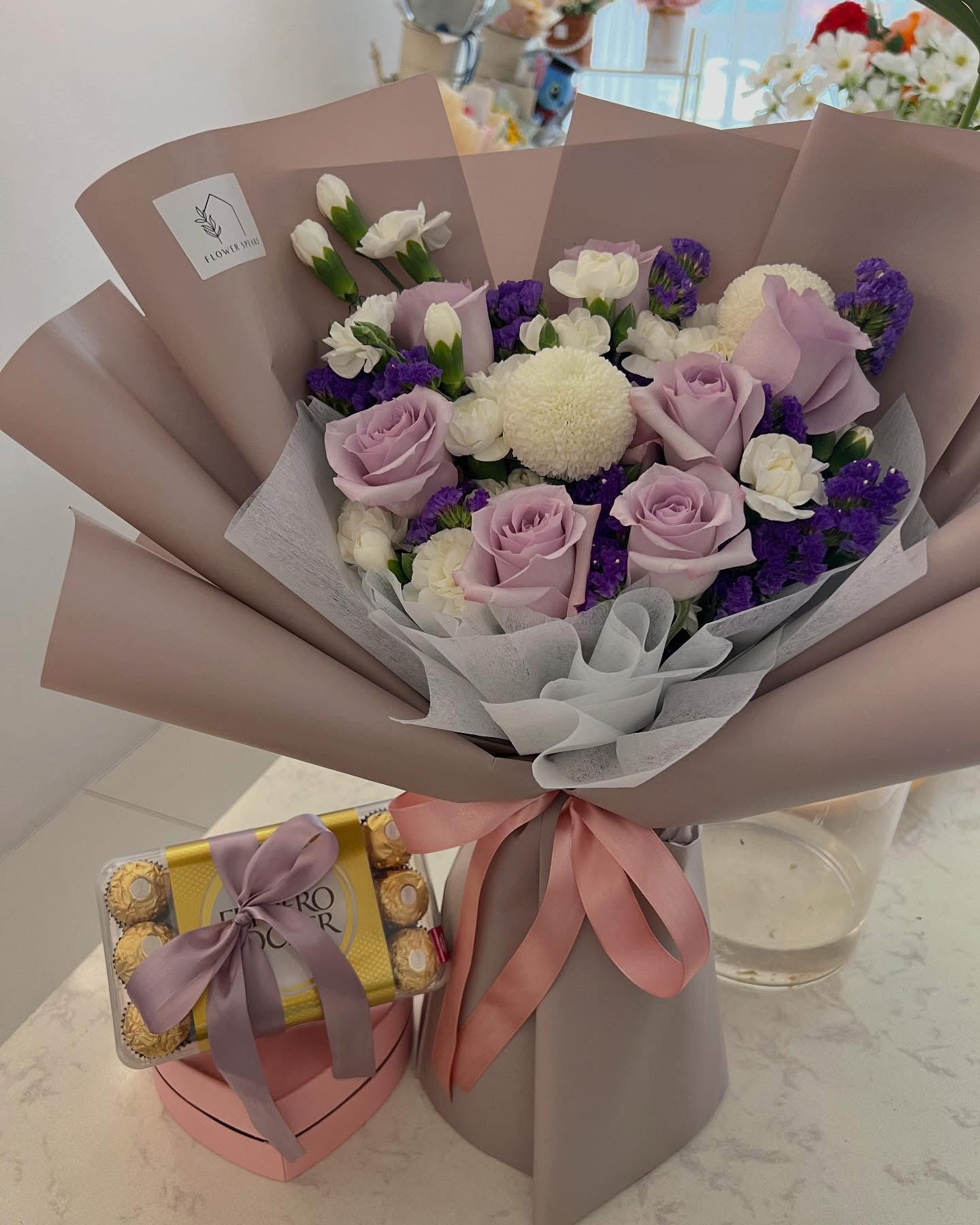 7 stalk Imported Light Purple Roses, 2 Pingpong Flower with Carnation spray and Purple Statice