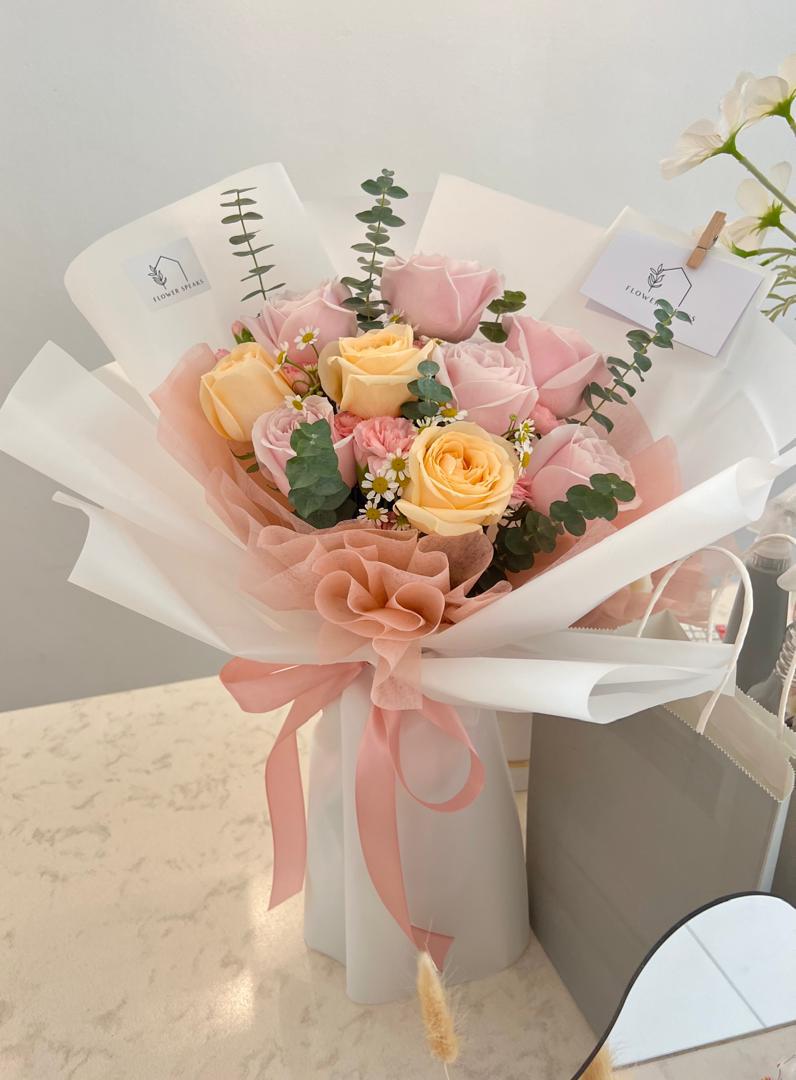 6 stalk Imported Pink Roses, 3 stalk Imported Champagne, with Chamomile and Eucalptus Leaf