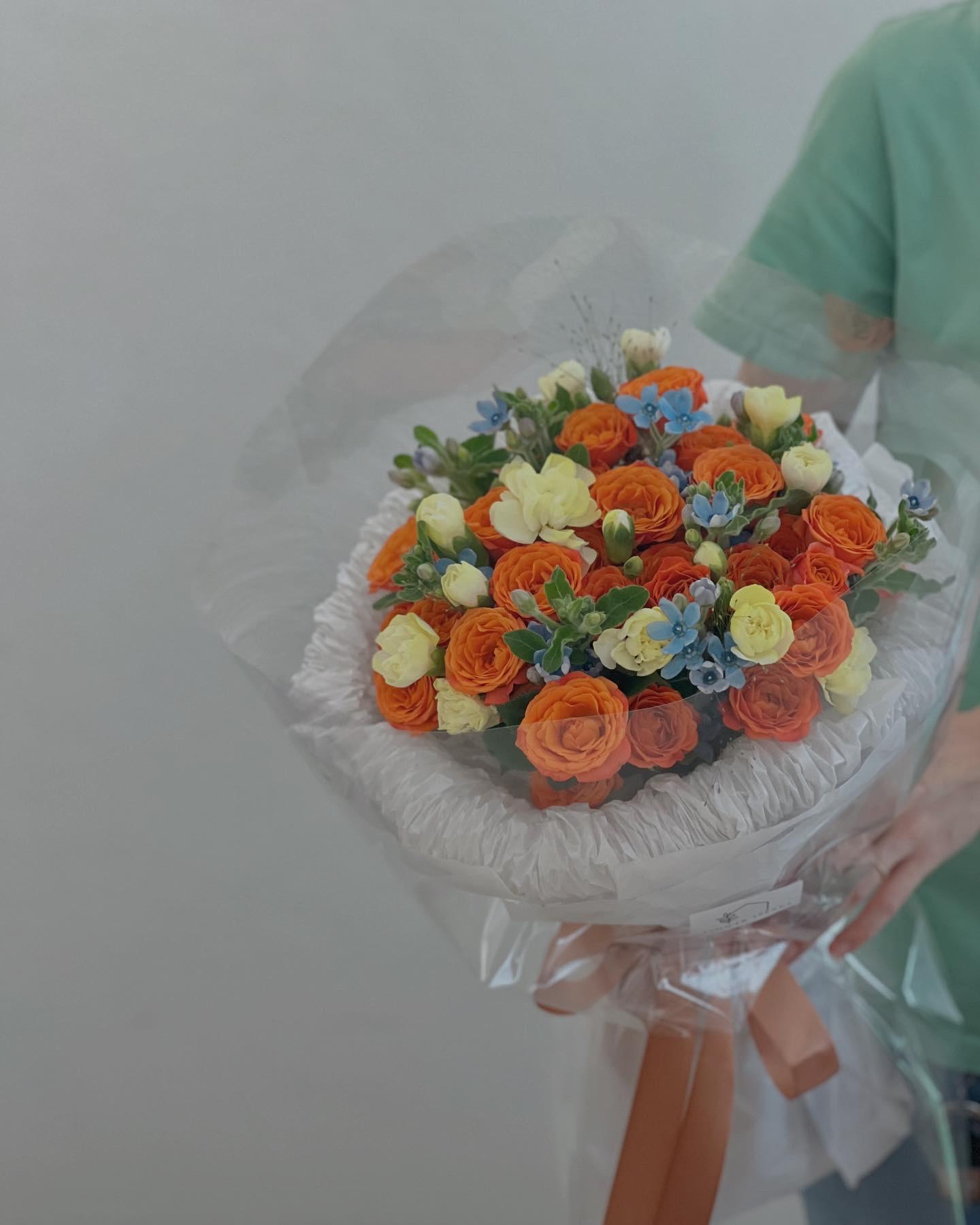 5 stalk Imported Rose Spray Orange, Carnation Spray Yellow and Blue Star