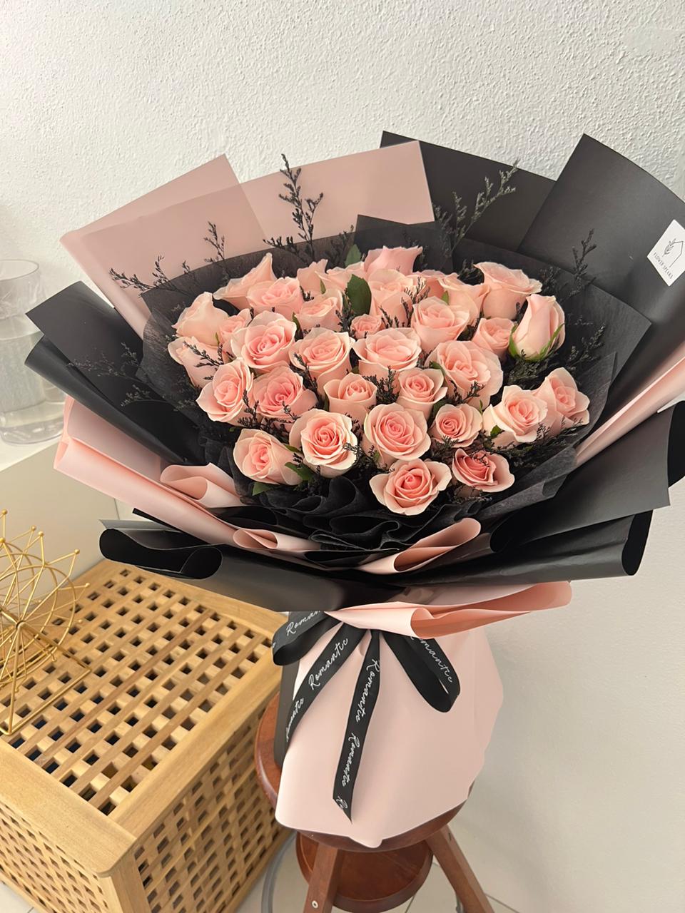 33 stalk Imported Pink Rose with Caspia Black