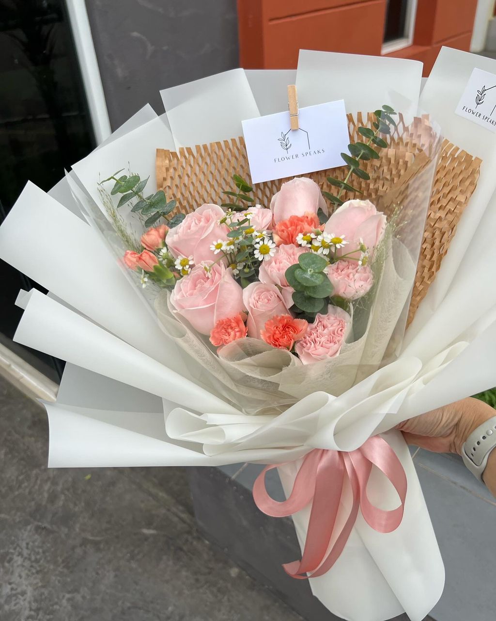Mix 9 stalk Imported Flowers (Pink Roses/Pink Carnation/Carnation Spray) with Chamomile Eucalyptus Leaf
