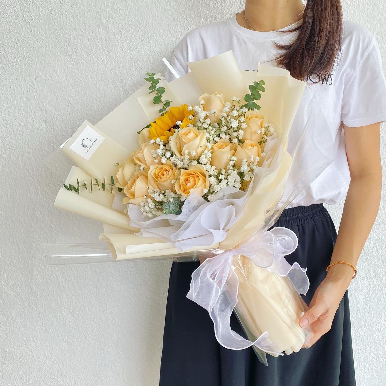 11 stalk Imported Champagne Roses , 1 Stalk Sunflower with Babyt Breathe & Eucalyptus Leaf